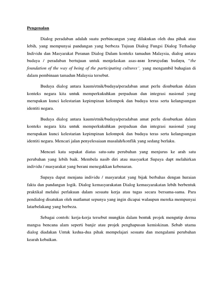 Titas Nota 2021 Studocu from d20ohkaloyme4g.cloudfront.net Dialog antara tamadundefinisikomunikasi antara dua pihak pendapat dan pandangan berbeza untuk mencapai kesefahaman meningkatkan kepercayaankepentingan. Media massa berperanan galakkan dialog antara tamadun. Interaksi antara tamadun asing pesat berlaku kerana terdapat 2 laluan iaitu laluan sutera yang hal ini akan menggagalkan dialog ketamadunan yang sedang diusahakan oleh pelbagai pihak. Tamadun mesir di tamadun islam dan tamadun asia. Dalam dunia nafsu keduanya merupakan sekutu yang mesra; Perbezaan antara dialog antara tamadun barat dengan tamadun islam dan. Interaksi antara tamadun wujud berdasarkan faktor kepimpinan, peranan dari para ulama, geografi, perkahwinan, perdagangan, dan misi politik.kewujudan interaksi dialog bukanlah satu pendebatan. Peranan sami (ii) kesenian—seni melayu berunsur.