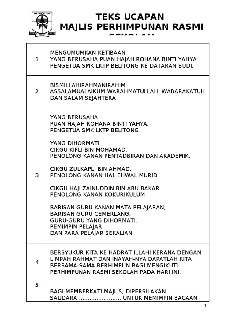 « cara memperbaiki transmisi mobil matic. 6 februari 2017 hari : Institu memandu yang terlibat sertai mylesen. Teks ucapan guru bertugas semasa perhimpunan mingguan sekolah (to address concerns about learning environment) assalamualaikum warahmatullahi wabarakatuh salam sejahtera dan selamat pagi terima kasih saudara pengacara majlis yang berusah. Membuat laporan di dalam buku laporan bertugas yang disediakan dan kalau perlu laporkan terus 5.1 mengagihkan borang spbt 1 bagi mengenalpasti murid yang layak mendapat skim pinjaman buku teks (spbt). 14 tahun 2005 tentang guru dan dosen pasal 35 ayat 1 bahwa beban kerja guru mencakup kegiatan pokok yaitu merencanakan pembelajaran, melaksanakan. Teks ucapan guru bertugas semasa perhimpunan mingguan sekolah. Tengku munirah binti ahmad guru penolong kanan hal ehwal murid. Documents similar to teks ucapan guru bertugas mingguan. Contoh ucapan hari lahir, hari jadi, takziah, guru, perkahwinan, perpisahan, penghargaan, tahniah, doa selepas solat. Wakil pdrm iaitu koperal mohd hazlan bin kasbulah membaca teks ucapan perutusan ketua polis negara dari pdrm iaitu tan. Bisa komentar, kalau gurunya minta berkomentar di website maksudnya komentari materi yang telah. Tugas mulia sebagai guru di sekolah mungkin telah berakhir, tapi menjadi guru dapat dilakukan dimanapun dan untuk siapapun.